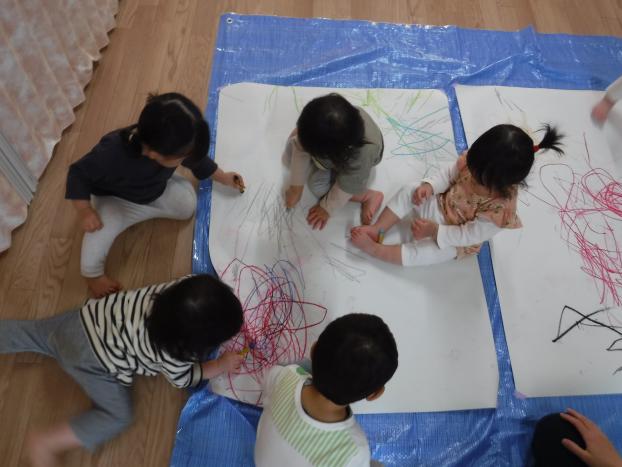 今日は大きな模造紙にクレパスでお絵描きをしました。