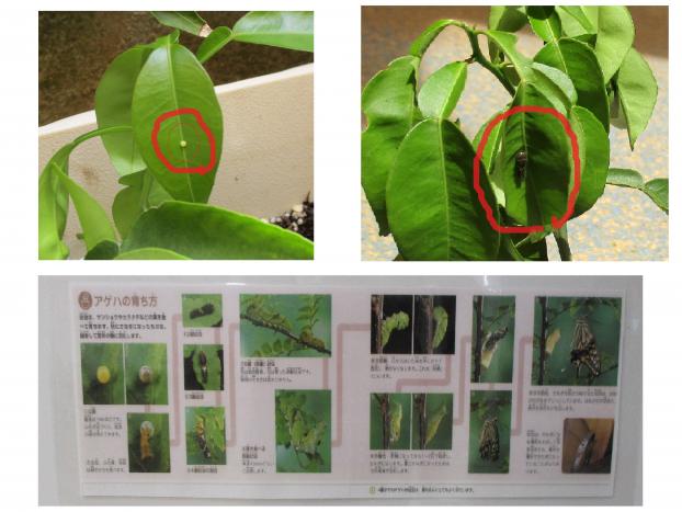 子どもたちは、図鑑を見ながら興味深々♪アゲハチョウの1ページをみんなの見えるところに貼り、あおむしの成長を観察できるようにしました♪