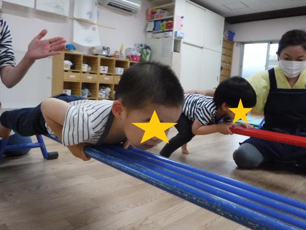 マットは高這いの姿勢でハイハイをして、平均台ではお腹をつけて腕の力で前進していきました。