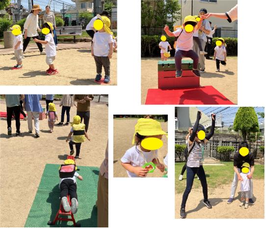 お家の方がゴールで待ってくれて「かけっこ」、体操「エビカニクス」「きんらきらぽん」、