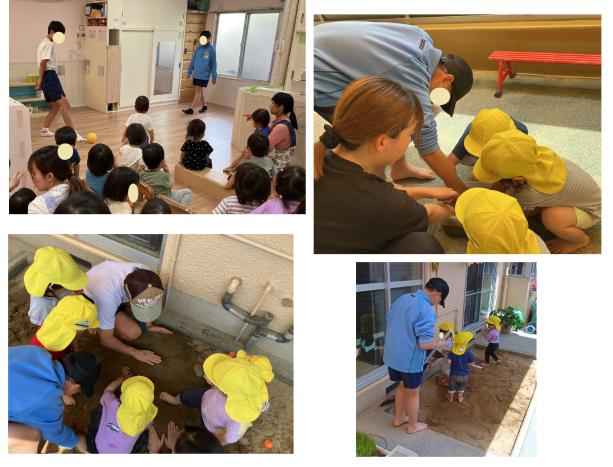 そして今日の保育は田植え!!!一緒にどろんこ!!!田植え用の土づくりをして、子どもたちで田植えをしましたよ♪その後みんなで砂場で遊び、大きなお山とトンネルを作ってくれました。最後には子どもたちと一緒にお掃除もしてくれました♪