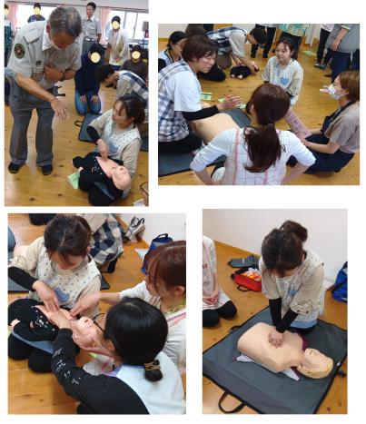 毎年職員みんなで講習を受け、心肺蘇生法やAEDの使い方を学んでいます。
