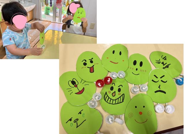 ”トライやる”に来てくれた二人のおにいさんがにじ組の子どもたちに”そらまめ紙人形”を作ってくれました。♪えんどうまめ そらまめ そら めがでたよ♪わらべうたを歌いながら跳ねたり歩かせたりして遊びました。