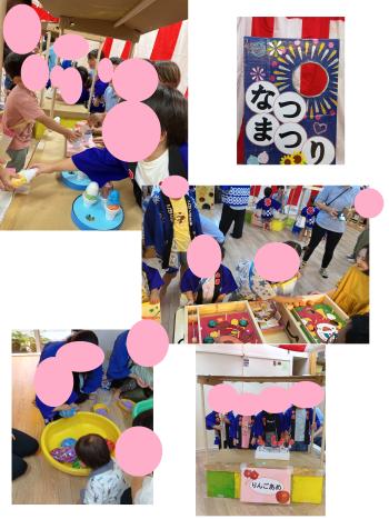 ヨーヨー釣りにボール転がし、宝さがしにスマートボールのゲームコーナーがあったり、くまグループの手づくり屋台にはアイスクリームとりんご飴が並んでいたり、みんなで盆踊りをしたりして楽しみました。くまグループはお店屋さんにも挑戦し「いらっしゃいませー!」と元気に呼びこみをしたり、「どうぞ」と言って小さい子にりんご飴を手渡したりとお兄ちゃん、お姉ちゃんらしさを見せていました。