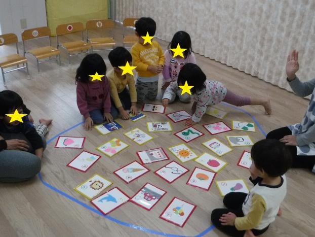 目の前の札を見て「せんせいこれ言って!」と催促するお友だち。