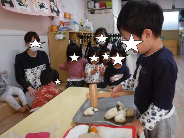 4日(木)くま組が育てたほうれん草を使い、みんなの大好きなドラえもんの「どら焼き」作りをしました。