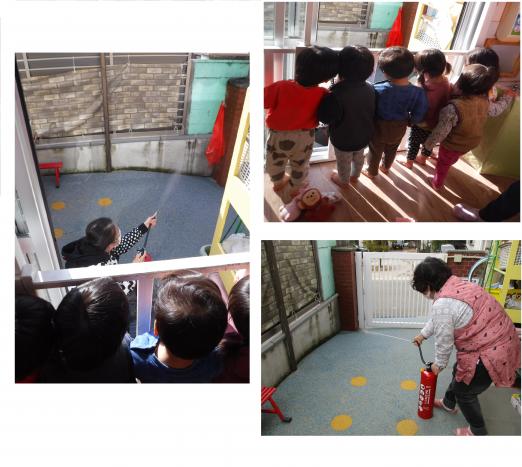 赤いビニールを火に見立て、そこめがけ訓練用の水消火器を噴射!子どもたちはお部屋から見ながら「せんせーがんばれー」と応援してくれていました。