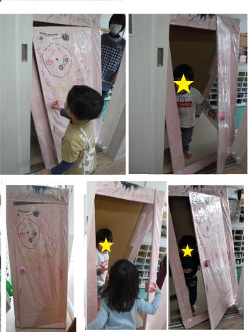 園庭に行くときやお部屋に戻ってきたときに「どこでもドア」をくぐっています。扉を開けてお友だちを迎え入れてくれる子もいましたよ(*^-^*)