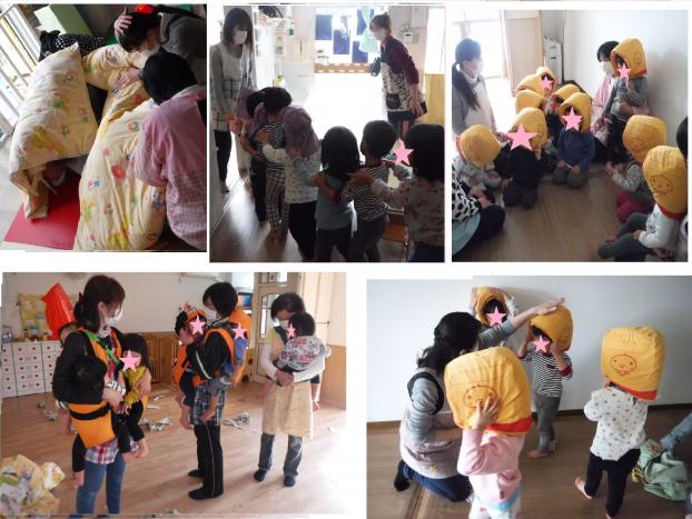 ひよこ組は、避難用の2人用、3人用の抱っこ紐を使い、避難をしました。