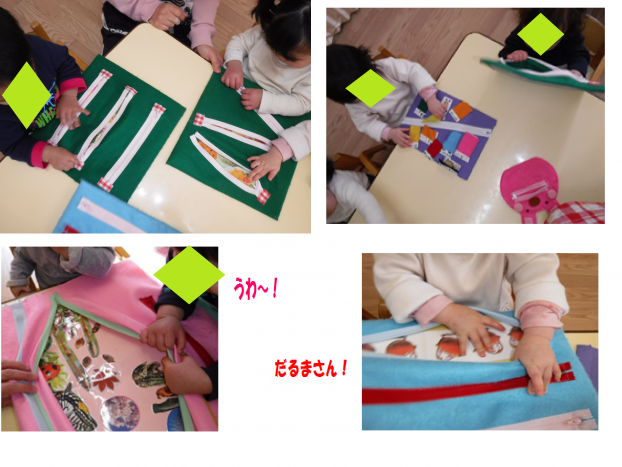 おもちゃが入っているケースのフタに、にこちゃんの絵が付いてかわいく、みんな箱の中を見るのが楽しみでワクワク♪