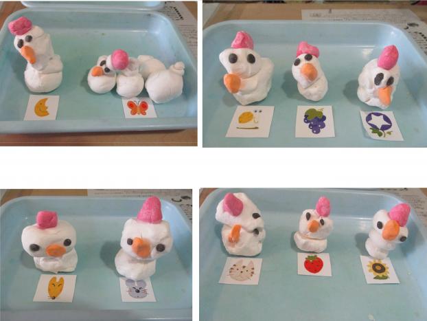 最初はいつもの油粘土の様に細長くしてヘビを作ってみたり、小さい丸を作ってみたりいろんな形の粘土でしたが「今日は雪だるまを作るよ」と声をかけると、絵本のねずみくんを思い出しながら紙粘土をコロコロ丸になるように手を上手に動かし、小さい丸や大きい丸が出来上がりました☆重ねて雪だるまを作り、帽子と鼻と目を付けるとかわいい雪だるまがたくさんできました♡