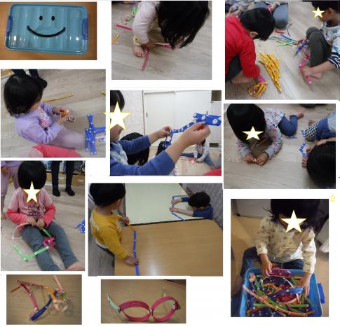 箱の中身は、スナップの付いたカラフルな紐でした。スナップは付けやすく、線路のように長くしたり、眼鏡のようにしたり早速いろんな形に大変身させていましたよ♪