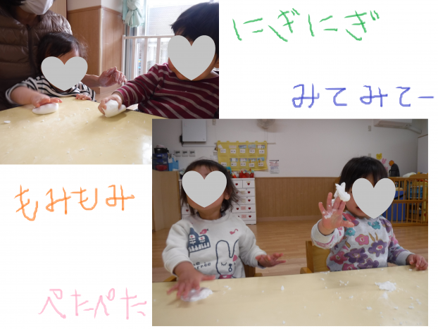 水の量を多くして手でこねられるくらいの感触では「きもちいね!」や「ゆきだるまつくったよ!」と自分たちのイメージを膨らませて様々な形を作っていました。