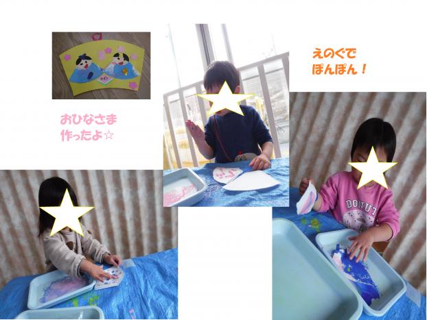 おひなさまを作りました!着物はコーヒーフィルターに絵の具でかわいく模様をつけました。「ゆびでぽんぽんしてみるね!」や「あおにするね!」と会話も楽しみながら作りました☆顔のパーツも自分たちでどこに貼るか考えて糊で貼りました。お部屋に飾ったおひな様を見て「おひなさま!」「かわいいね!」と嬉しそうに話してくれました。