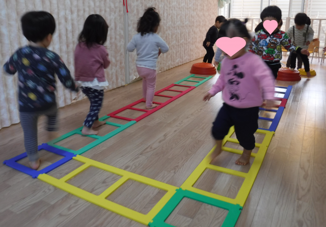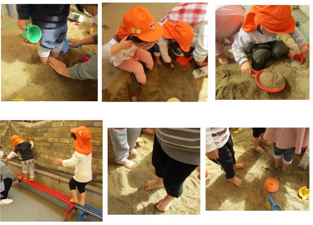「おすな、きもちいいね(*^-^*)」「あし、こそばいよ~」と言いながら、お砂の中に足を隠してみたり、はだしで平均台をわたってみたり、気持ちいい陽気の中✿園庭遊びを楽しみました♪