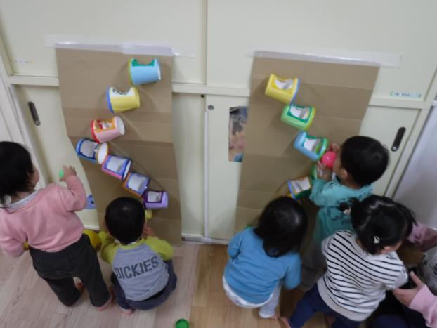 ボールを転がすとコロコロと下に転がっていくのが面白くて夢中で見入っていました。カップからカップへ落ちる際も「カタ、カタ」と音がするので落ちる度に大喜びしていました。カップの穴に器用にボールを入れて楽しむ子ども達でした!