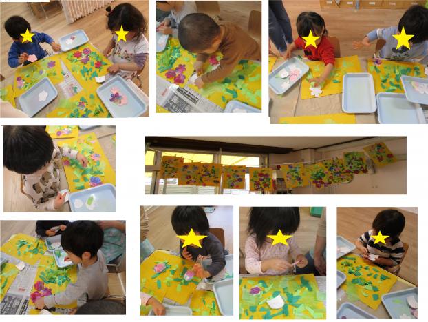 今日は、葉っぱをイメージして黄緑のお花紙をちぎり、のりの付いた台紙にちらしました。それに先日作った花を指にのりをつけて貼っていきました♪