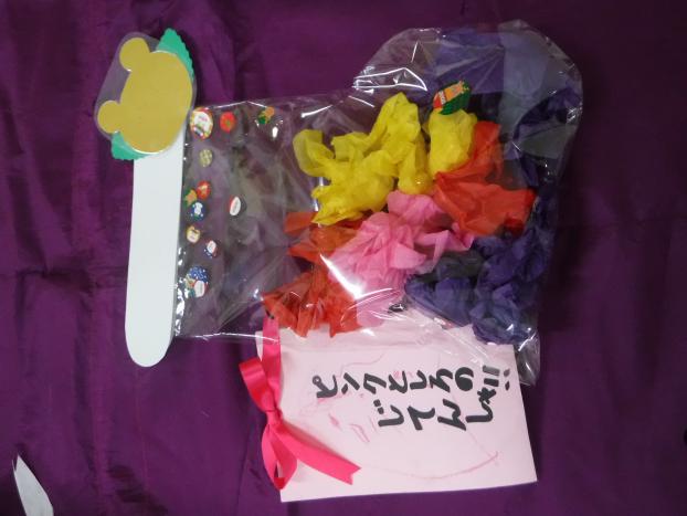 まず16日に画用紙にポスターカラーでスタンプしました。保育士がお花の形に切って今日のために準備♪
