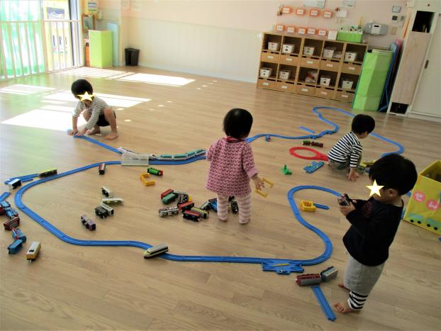 ひよこ組のお友だちも電車や線路を持ってきたり、うさぎ組のお友だちは線路の上で電車を走らせたり、くま組のお友だちはどんどん線路を伸ばしていき、みんな一緒になって遊んでいました♪