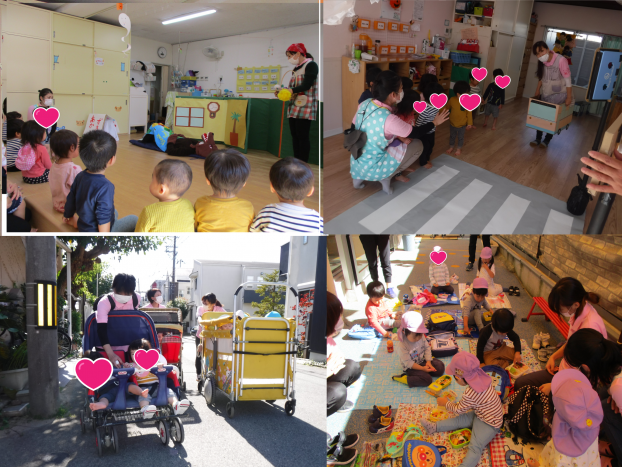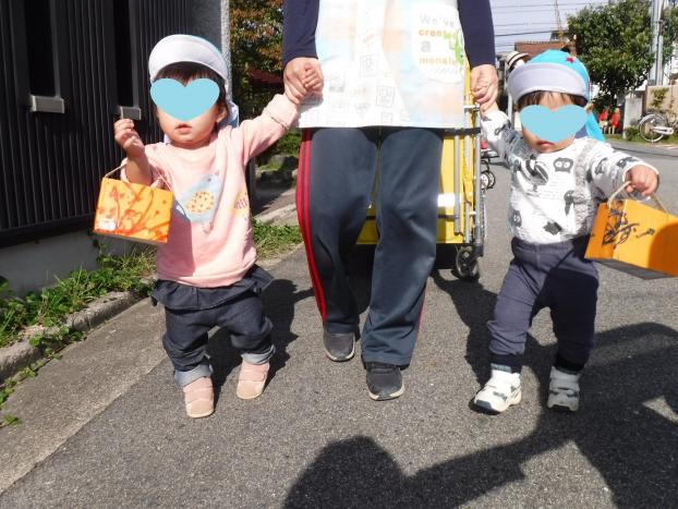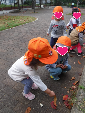 お友だちと仲良く手を繫いで秋の散歩を楽しんでいます☆電車を見て「はんしんでんや!」と話したり車を見て「ゆーびんしゃ!」と教えてくれたり!芝生広場では今が見ごろの紅葉!落ち葉がたくさん!「みて~!」と拾って見せてくれたり落ち葉の道を歩いて落ち葉の歩く感触を楽しんでいます♪引き続き秋の散歩を楽しみたいと思います★