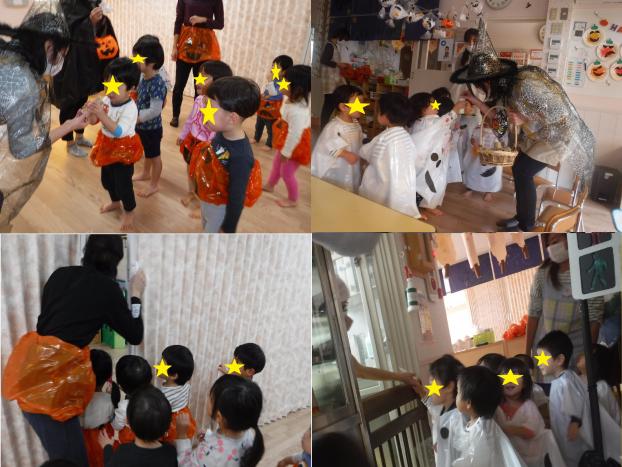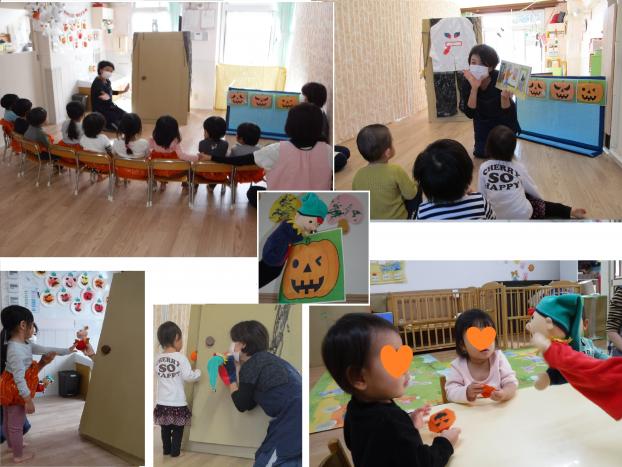 英語の音楽で体操をしたり、大きな扉をノックするとかわいい動物が出てきてプレゼントをもらったり、リズムに乗って「ハッピーハロウィン♪」と声をかけ楽しそうな子どもたちでした♪