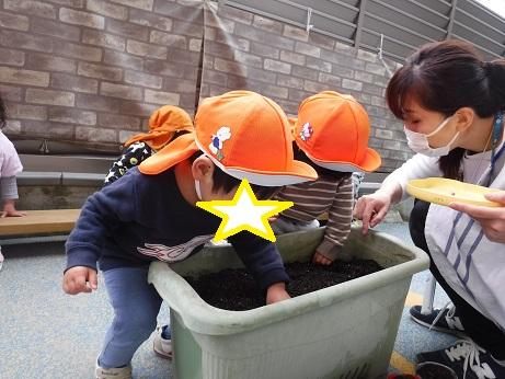 給食の食材にも興味津々!豆類をみつけると「おまめさん!」と嬉しそうに保育士に知らせてくれます!身近な野菜を選んで決めました。種を手にのせてプランターの中へ!土のお布団もかけてくれて最後は水やりもしてくれました。成長が楽しみですね!大きく大きく育ってね~♪