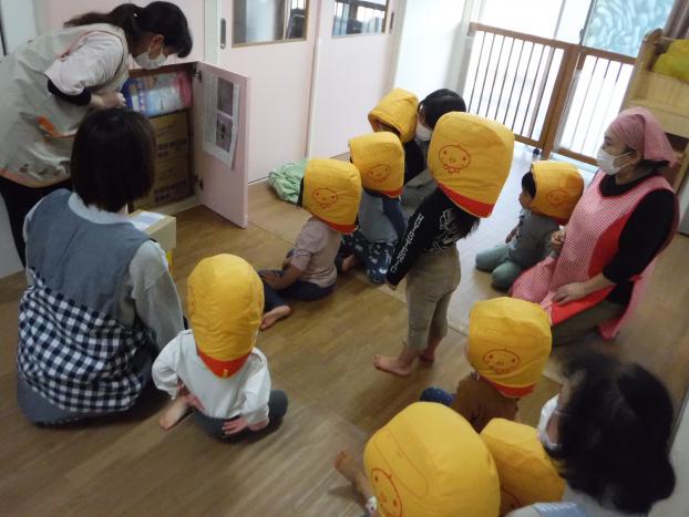 玄関に用意してある防災頭巾は職員が持って上がり、2階でかぶりました。その様子がとても可愛いんです。「頭を守ってくれるんだよ」と頭をぽんぽんとしたら「いたくないねー」と防災頭巾の効果を感じていました。