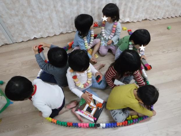 ブロックでつなげた輪の中に一人お友だちが入ると次々とお友だちが♪