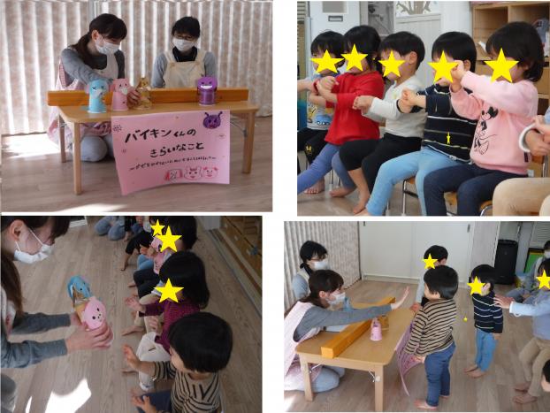 お楽しみ会で、佐藤先生と看護師の鈴木先生が、バイキンくんのおはなしをしてくれました。