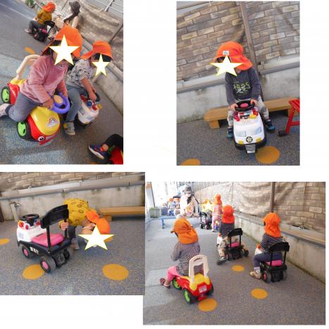 友達の乗っているコンビカーが貸してほしくて「かして!」と「いいよ!」のやりとりもしてと交代も上手にしていました♪「バックしまーす!」と後ろに押してみたり「はやいね!」と勢いよく走ってみたり…みんなで仲良く楽しみました!