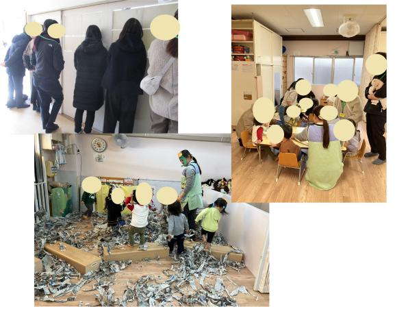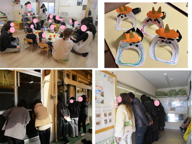 保護者の姿が見えないように、窓に覗き穴を作って、普段通りの子どもたちの姿を見てもらいました。参観では鬼のお面の制作にとっても集中していて、その後の豆まきごっこでは「鬼は外~!!」と楽しそうでした(*^-^*)