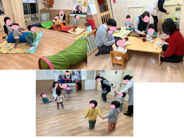 お友だちと仲良くリズムを楽しんだり、手を繋ぐ姿を見てもらいましたよ!