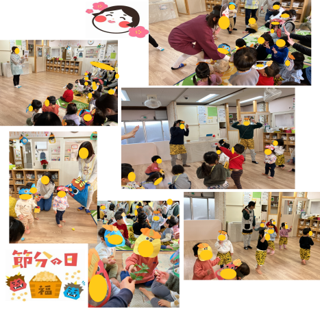 今日は節分の集いをしました。みんなで「まめまき」を歌ったり、節分の由来のお話を聞いたり、豆まきをして楽しみました。くまGは鬼のパンツを履いて登場し、「おにのパンツ」を踊りましたよ。豆まきでは、「おにはそと~」と言いながら上手に豆を投げる子どもたちでした!