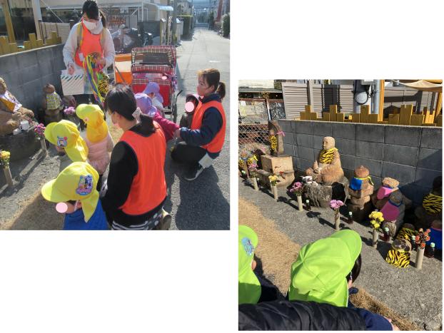 にじ組のお友だちが、おじぞうさまの前掛けを付け替えてくれました