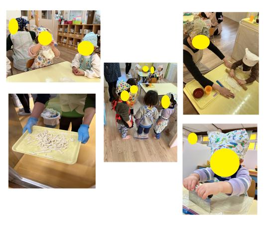 今日はうどん作りをしました。何を作るのか子どもたちに聞くと「うどんだよ!」と楽しみにしている様子でした。材料をこねたり、足でふみふみしたりしました。踏みながら「なんかきもちいいね!」と嬉しそうな子どもたちでした。めんぼうでのばしたりスキッパーでうどんの形に切ったりもしました。茹でている所を見せてもらうと「およいでるよ!」とじーっとみる子どもたちでした。みんなで作ったうどん、おいしかったね!