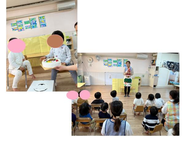 3月生まれのお友だちのお祝いをしました。♪タンタンタンタンたんじょうび~♪みんなのお歌のプレゼントに合わせて鉄琴や太鼓で演奏のかわいい音楽隊になりました♪