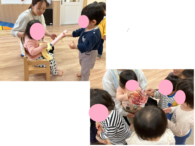 お別れ会では、園歌を歌ったり、保育士からはぎゅーのハグ、お友だちからはお絵描きや花束のプレゼントをもらいました。