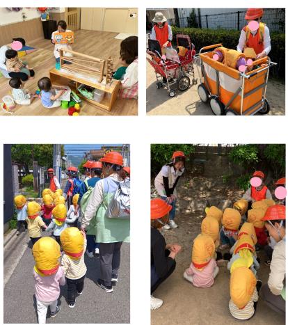 公園では、子どもたちを安全な場所に集め、全員の無事を確認した後、保育園に連絡しました。園からは保育士、看護師、給食の職員が防災頭巾とヘルメットを持って、今日の行く公園を確認し、応援に駆け付けました。