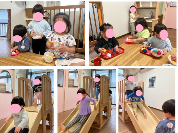 にじ組の保育室には置いていない、室内すべり台やままごとのキッチンで楽しみましたよ(*^-^*)