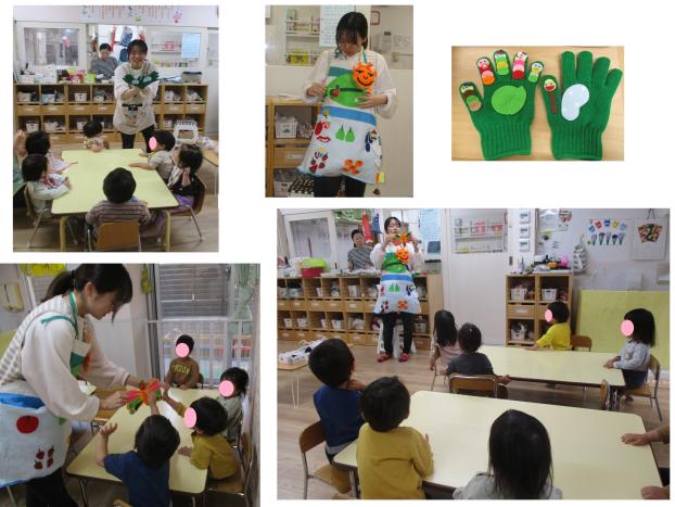 おやつの準備ができるのを待っている間に、今日は「はらぺこあおむし」のエプロンシアターと「キャベツの中からあおむし出たよ♪」の手袋シアターをしました♪