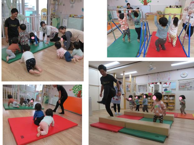 くまグループ、うさぎグループに分かれてお友だちと一緒にマットや一本橋、鉄棒などで身体を動かしました。