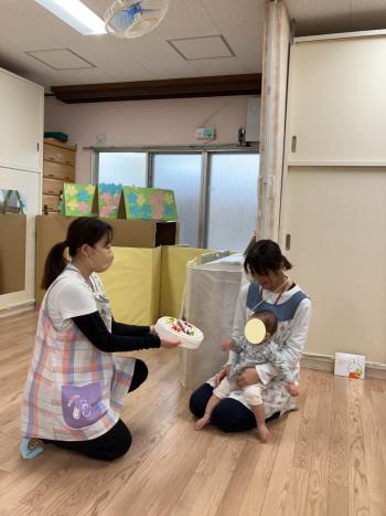 保育士がやり方の話しをしながらやってみせると興味津々で見ていましたよ。