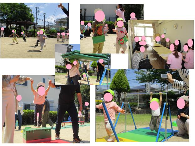 お母さん、お父さんの元へかけっこをしたり、一緒に体操をしたり、サーキットをしたりと沢山身体を動かしました。