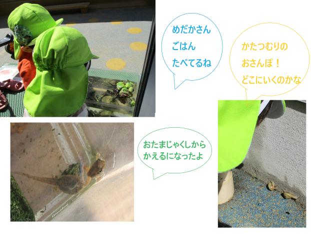 子どもたちは、かたつむりや、めだか、あおむしなどたくさんのお世話をしてくれています(*^-^*)
