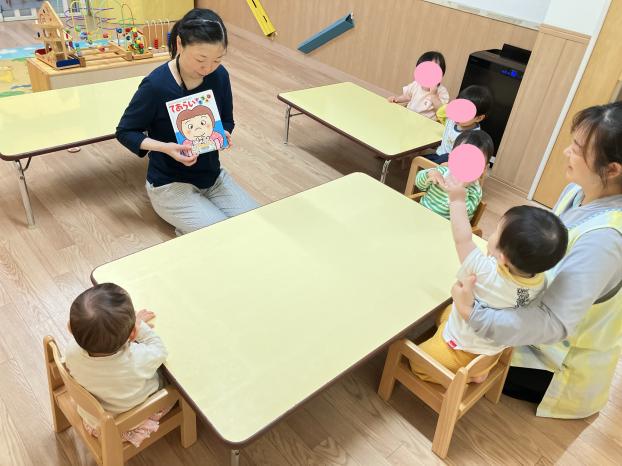 絵本の話を聞きながら、“ごしごし”言葉に合わせて手を洗うしぐさをするお友だちもいましたよ♪