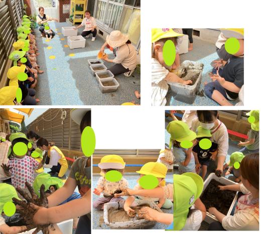 みんなワクワクして泥んこを触りにきていました。泥がついた手をじーっと見たり「ばあ~」と泥の手を見せて笑ったりしながら、混ぜて捏ねて土作りをしました。