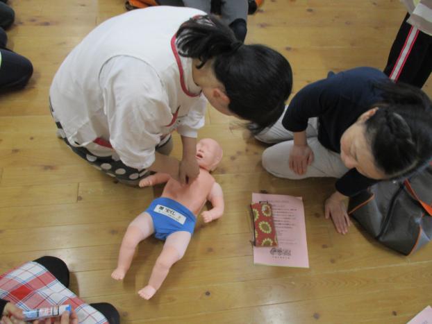 心肺蘇生では、乳児は指2本、幼児は片手、大人は両手で行うことを人形で実践して訓練を行いました。