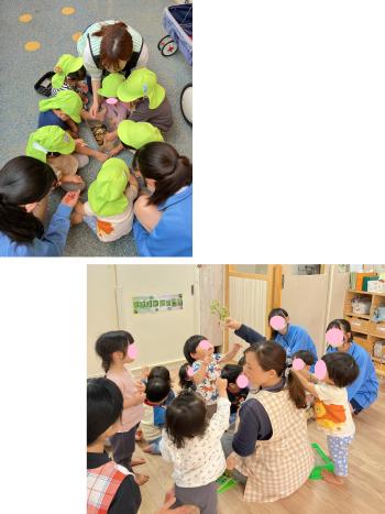 最初は恥ずかしそうにしていた子どもたちでしたが、一緒にお話を聞いたり、飼育している虫を見たり、リズム遊びを一緒にして楽しんでいました♪