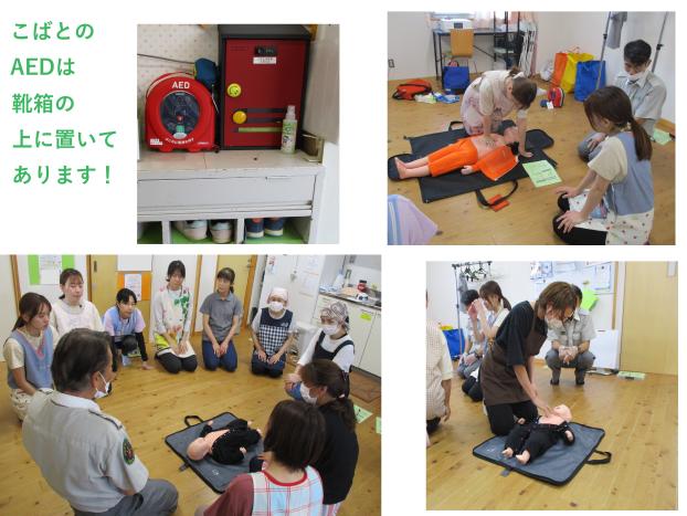人形を相手に訓練しますがとても緊張します。保育園なら「〇〇先生119番してください」街中では「ピンクの服の方、AED持ってきてください」と指名して依頼するのがポイントだそうです。