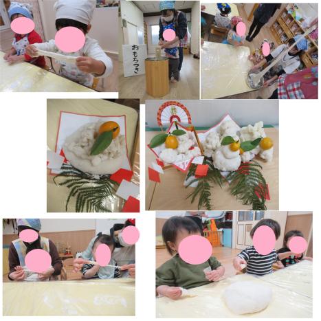 おもちを伸ばして大喜びの子どもたち!最後に鏡もちをクラスごとに作りました。廊下に飾っていますので是非見て下さいね♪